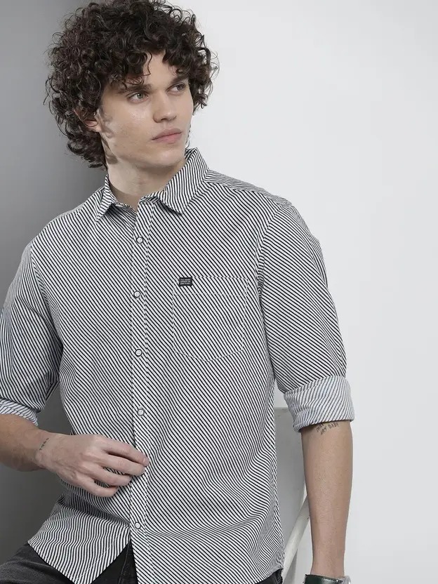 Men Regular Fit Striped Cut Away Collar Casual Shirt
