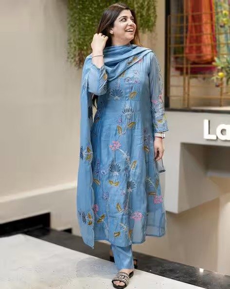 Embroidered Floral Kurta Pant Dupatta Set – 3 Piece. Floral embroidered kurta set. Blue Anarkali kurta set. 3 piece kurta pant dupatta set. Ethnic wear for women. Elegant Indian wear. Designer kurta set for women