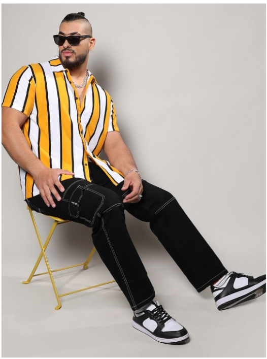 White vertical striped casual shirt ,has a spread collar, short regular sleeves, straight hem