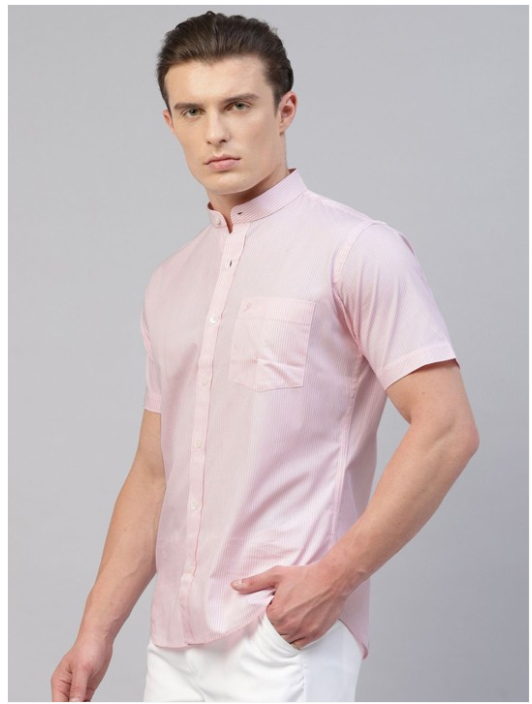 Pink Pinstripes opaque Casual shirt ,has a Band Collar, button placket, 1 pocket, short regular sleeves, curved hem