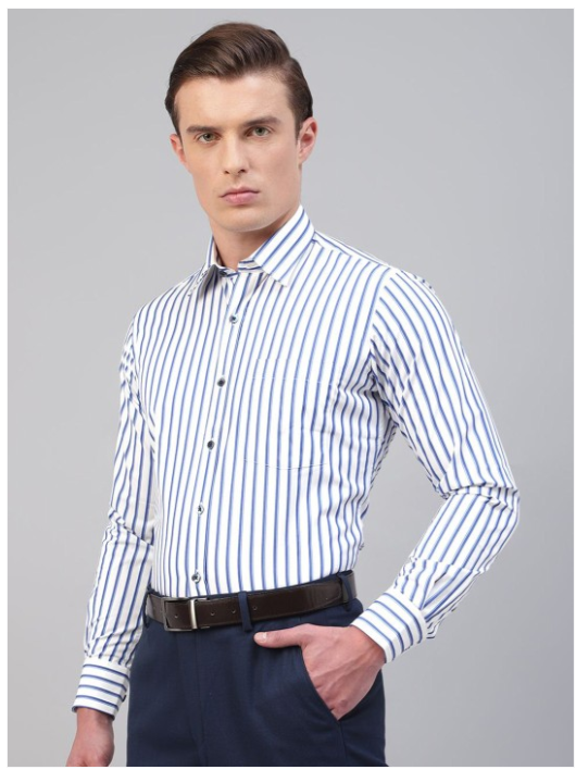 Blue vertical stripes striped opaque Formal shirt ,has a spread collar, button placket, 1 pocket, long regular sleeves, curved hem