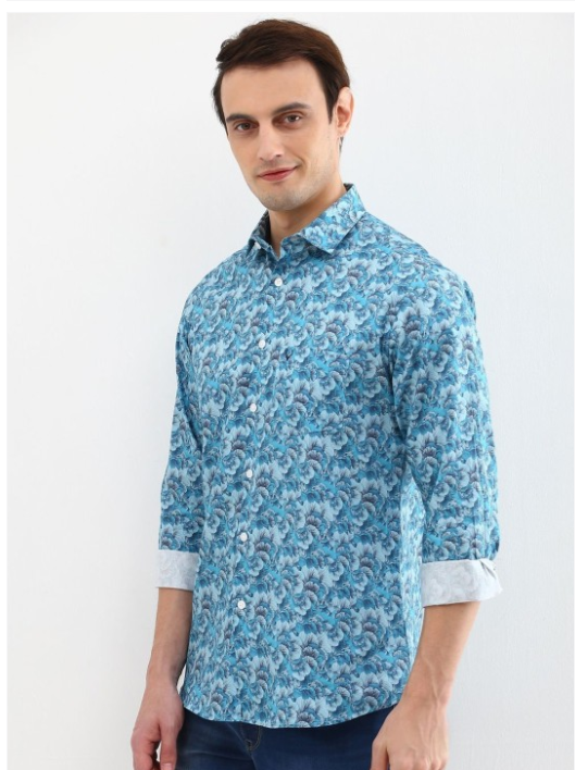 Blue floral printed opaque Casual shirt ,has a spread collar, button placket, 1 patch pocket, long regular sleeves, curved hem