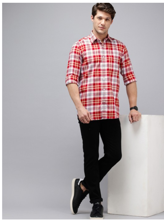 Red and white checked opaque Casual shirt ,has a spread collar, button placket, 1 patch pocket, long regular sleeves, curved hem
