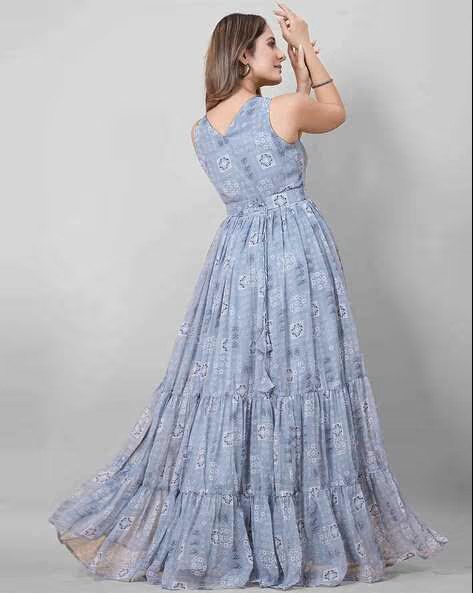 Elevate your ethnic charm with this graceful ready-to-wear gown crafted from premium faux georgette fabric. Designed with a sleeveless bodice and a beautifully tiered flare, this fully stitched gown comes with a soft inner lining for added comfort. The soothing pastel shade combined with delicate printed motifs makes it a perfect pick for festive occasions, brunches, or daytime functions.