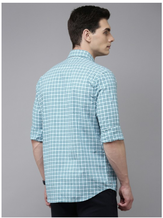 Blue & white checked opaque casual shirt, has a spread collar, button placket, 1 patch pocket, long regular sleeves, curved hem