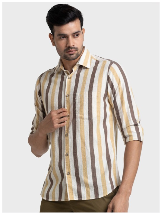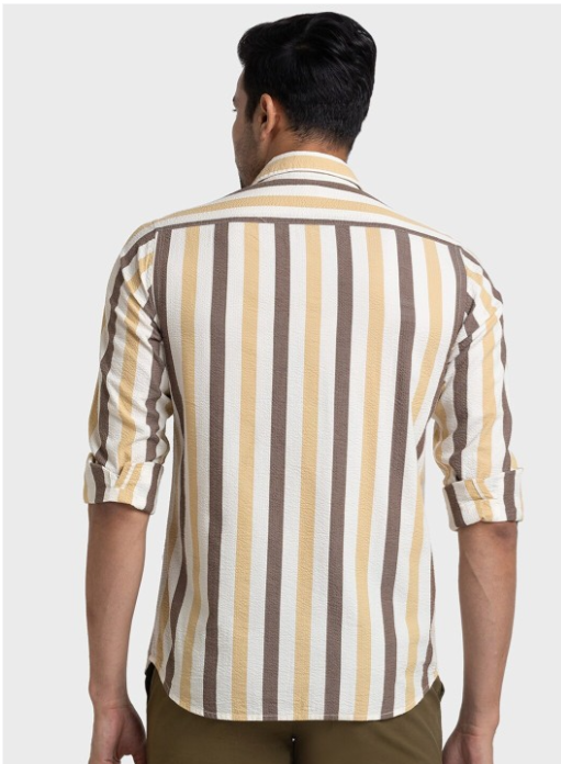 Brown and yellow vertical stripes opaque casual shirt, has a spread collar, button placket, 1 patch pocket, long regular sleeves, curved hem