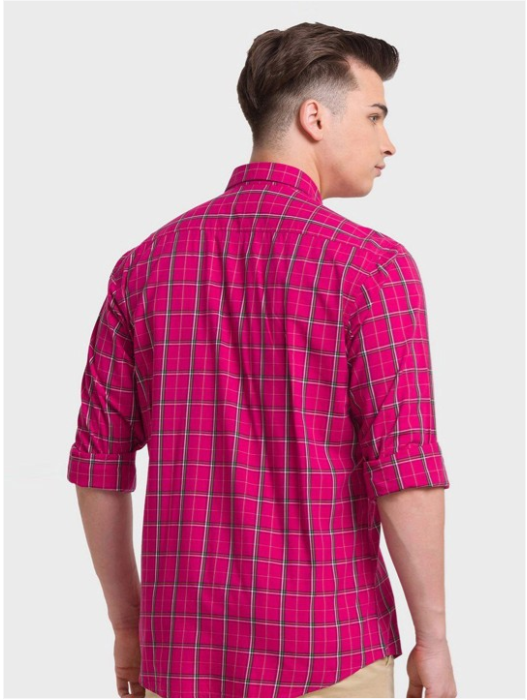 Pink tartan checks checked opaque Casual shirt ,has a spread collar, button placket, 1 patch pocket, long roll-up sleeves, curved hem