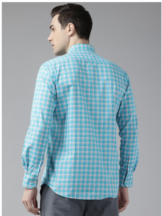 Blue and white checked opaque casual shirt ,has a spread collar, button placket, 1 patch pocket, long regular sleeves, curved hem