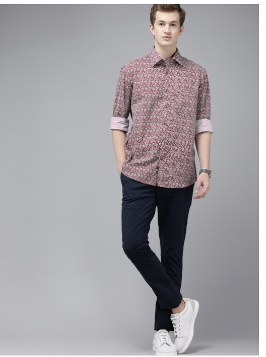 Maroon floral printed opaque casual shirt ,has a spread collar, button placket, 1 patch pocket, long regular sleeves, curved hem