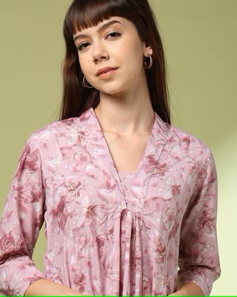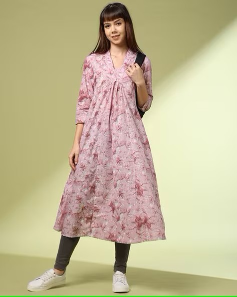 • 100% cotton cambric floral printed a-line kurta. It has a v-shaped neckline with front placket and 3/4th sleeves