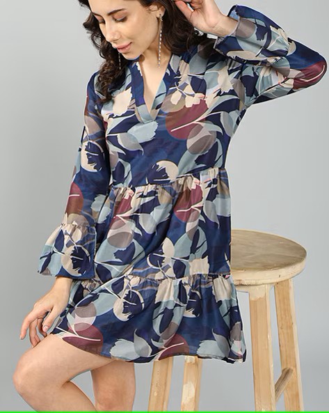 Shein Flounce Sleeves Pleated Hem Abstract Print Skater Dress
