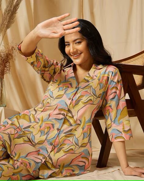 • The model is wearing a co-ord set that features a vibrant and artistic pattern of leaves in various pastel colors like pink, yellow, blue, and green. The top is a button-down shirt with a collar, and it has three-quarter sleeves. The palazzos are loose-fitting and flowy, complementing the relaxed fit of the shirt.