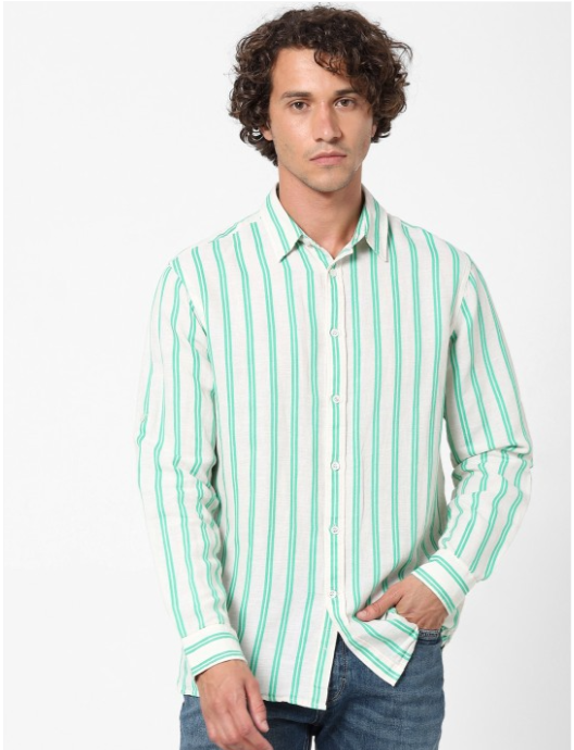 Off white vertical stripes striped opaque Casual shirt ,has a spread collar, button placket, pocket, long regular sleeves, curved hem