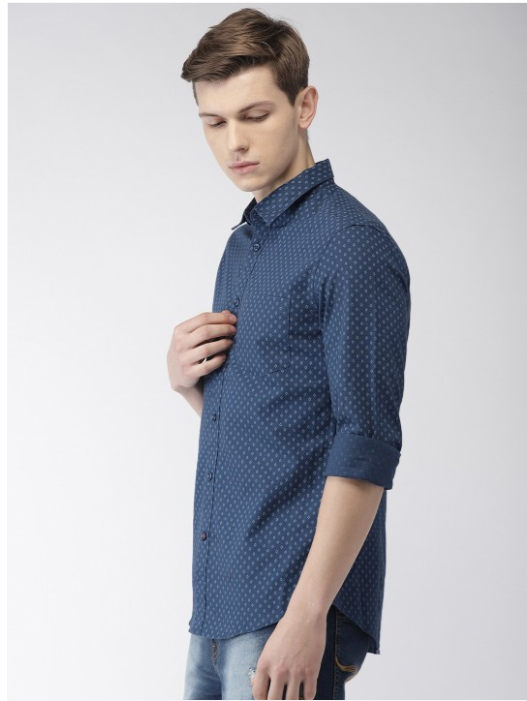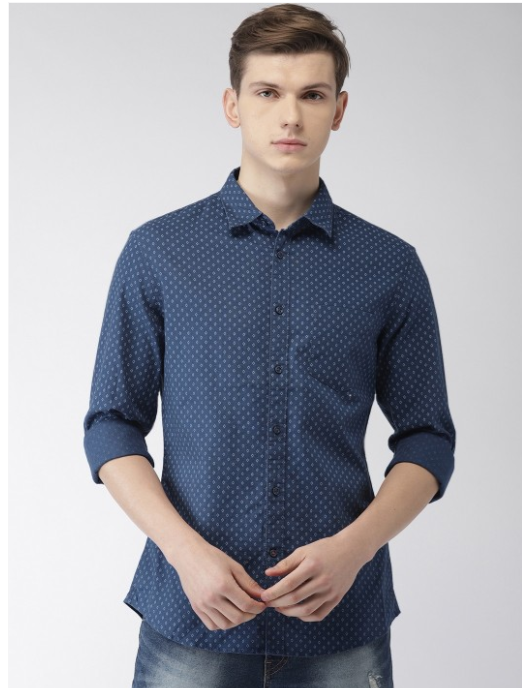Blue printed casual shirt, has a spread collar, long sleeves, button placket, curved hem, and 1 patch pocket