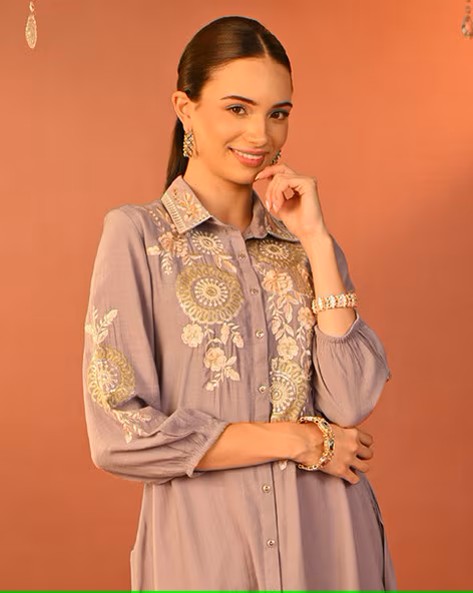 • > breathable fabric > thread embroidery with zari and sequin highlights > metal buttons > gathers on sleeve ends > back yoke > inverted box pleat at the back.