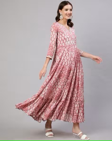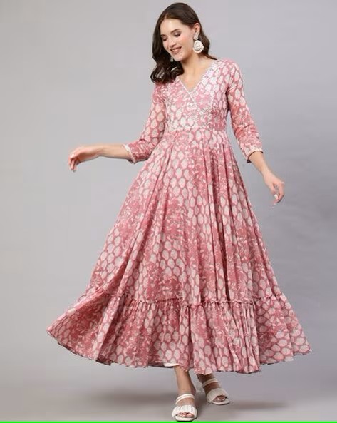 Floral Print V-Neck Flared Kurta